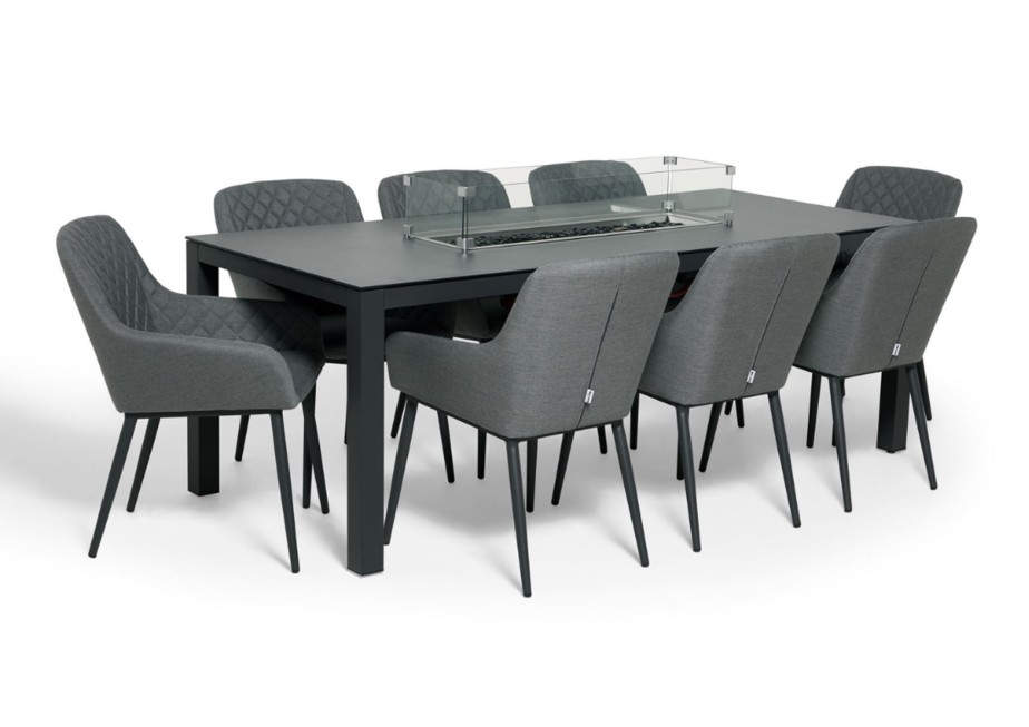 • Includes: 8 x Dining Chairs | Table with Fire pit | Glass casing for the fire Pit | Cover for the fire pit area | Cast Iron Grill Plates | Glass Firestones | Waterproof Furniture Cover