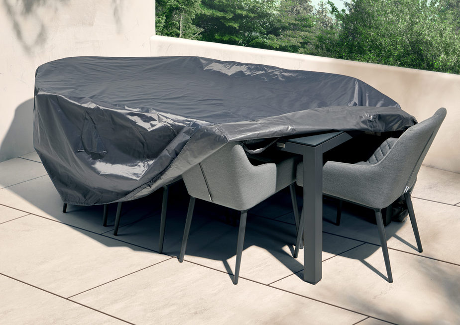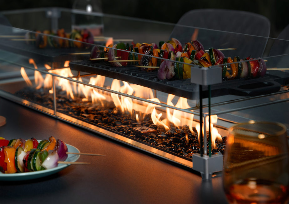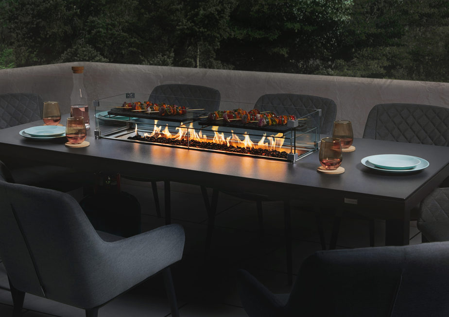 Stay warm on those cool evenings and enjoy entertaining in the garden for longer with the Aruba 8-Seater Outdoor Dining Set with Fire Pit Table. A modern fire pit built into the garden dining table completes this luxury outdoor furniture set and includes cast iron grill plates, perfect for Raclette dinner parties or alfresco cooking. Alternatively, you can hide the fire pit to increase your surface area and use it as a lovely casual dining area.