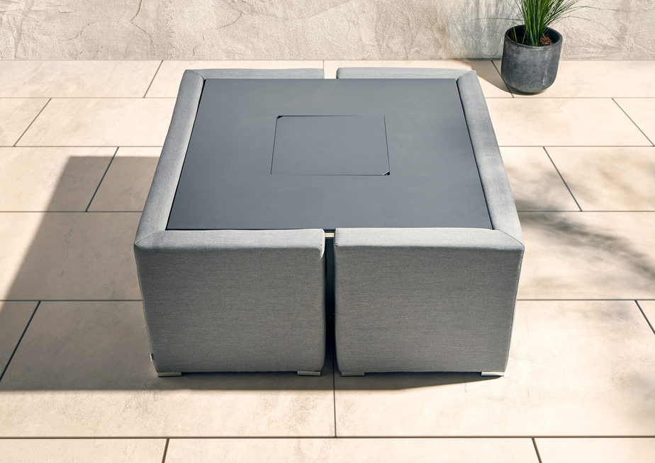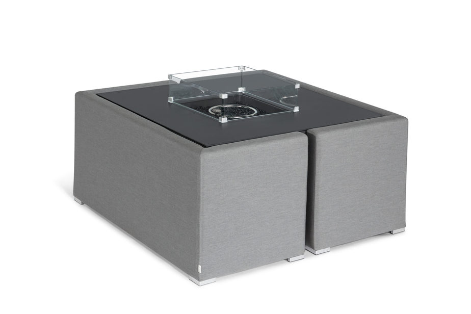 The Cube Set with Fire Pit Table is part of the Aruba collection, built to last using the best outdoor fabric and materials. The table fire pit is easy to use and easy to store away after use. (Gas bottle not included) It can also be used as a garden dining table, ideal for seating up to 8 people!