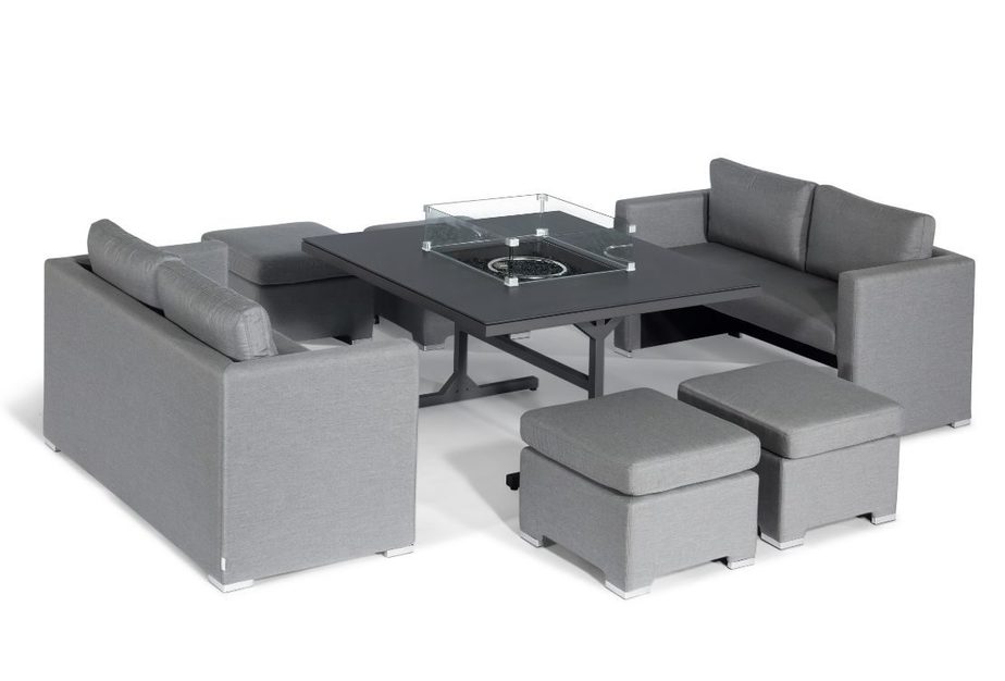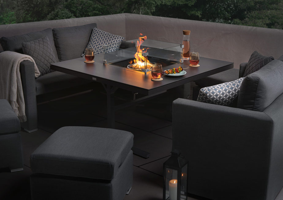 - Includes: 2x 2-seater sofas, 4x stools, 1x Square Fire Pit Table, Glass Surround, Grill Trays, Firestones, 1x FREE Waterproof Cover